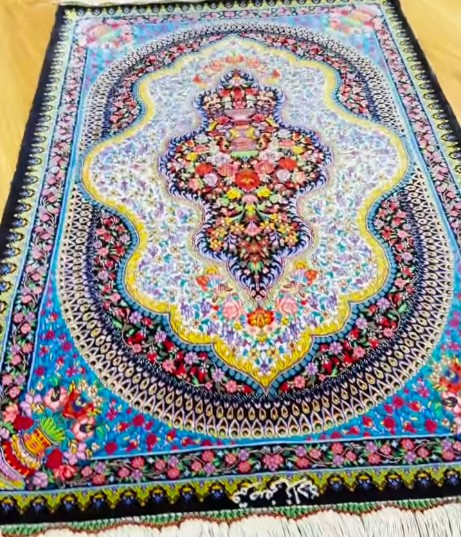 تابلو فرش دستباف پشتی قم (نقشه شکارگاه آبی)