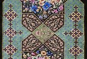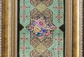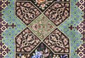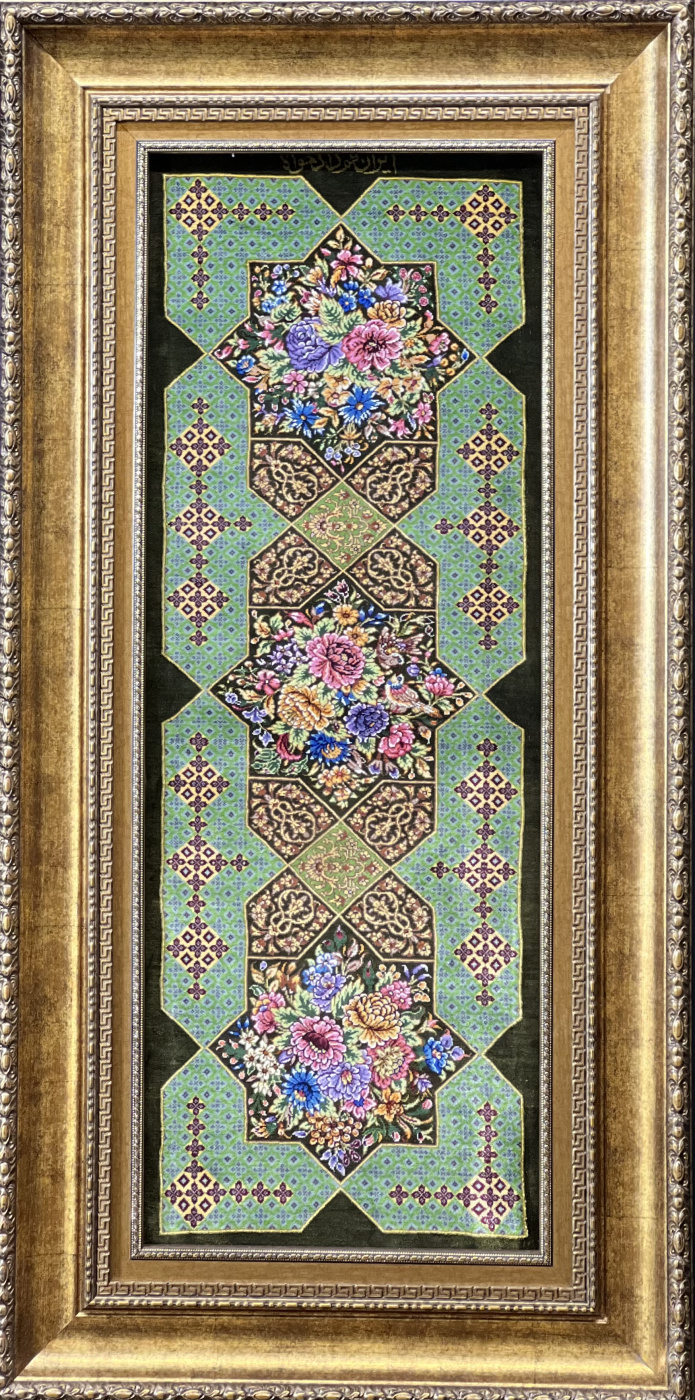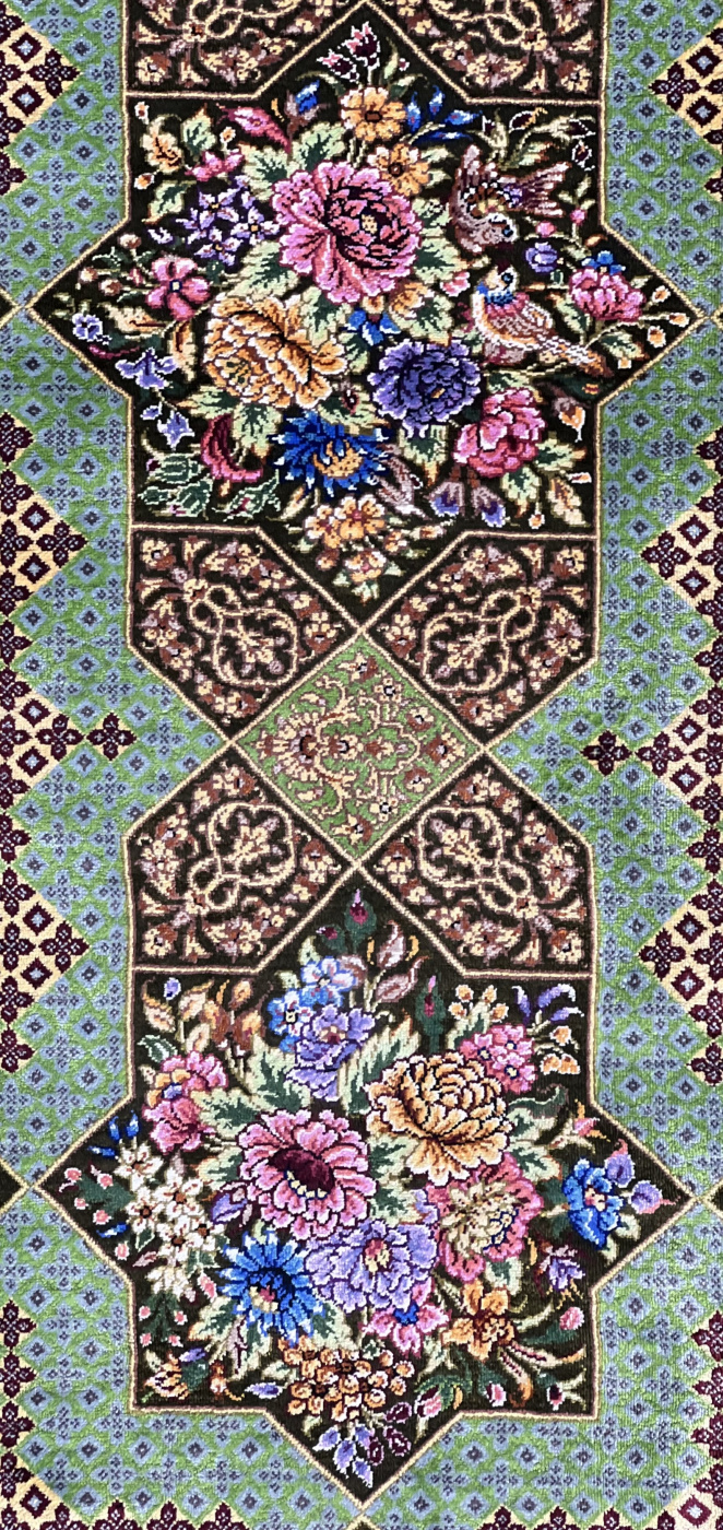 فرش دستباف کوچک پارچه قم (نقشه قاب قابی سبز)