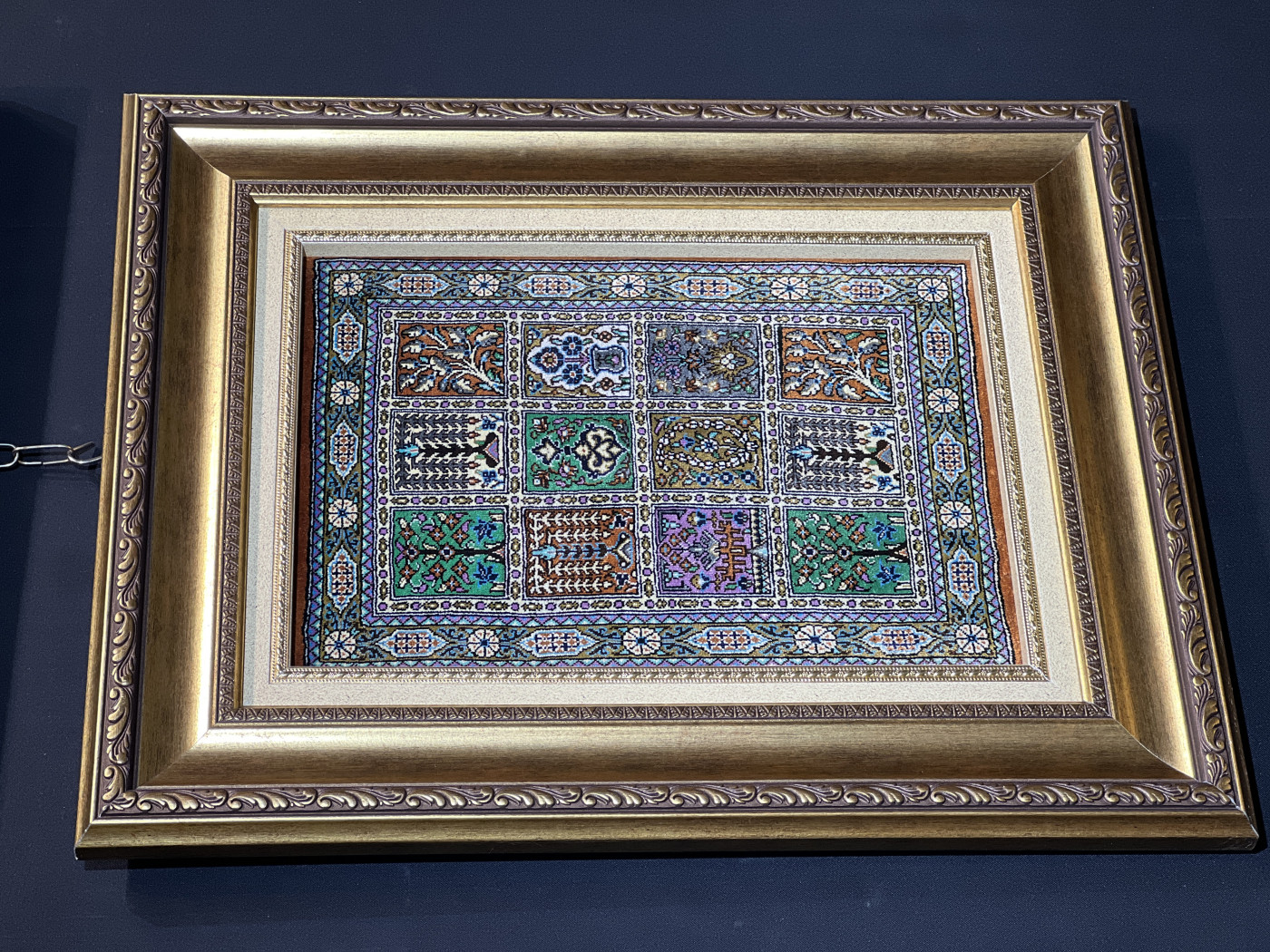 تابلو فرش دستباف کوچک پارچه قم (نقشه خشتی طلایی)