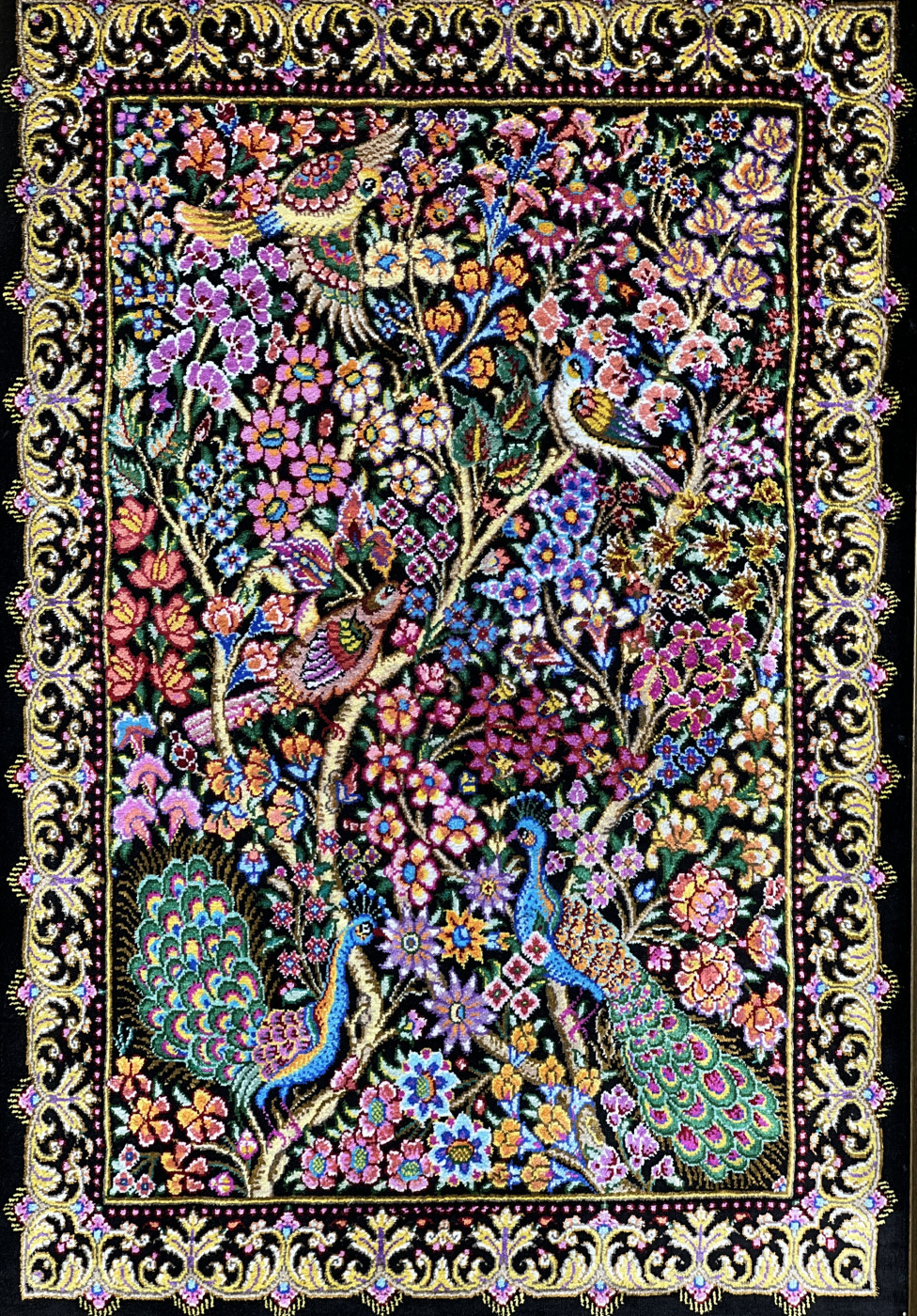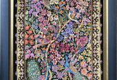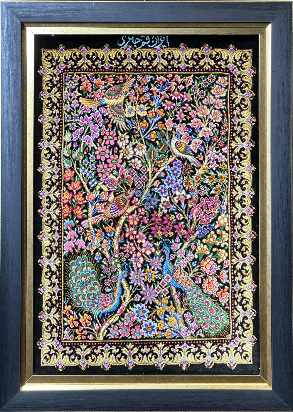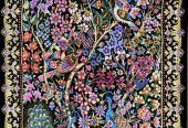 تابلو فرش دستباف کوچک پارچه قم (نقشه باغ پرندگان مشکی)