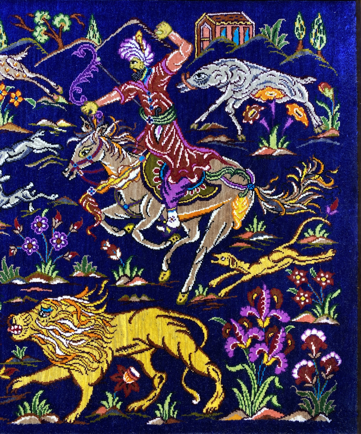 تابلو فرش دستباف پشتی قم (نقشه شکارگاه الوان)