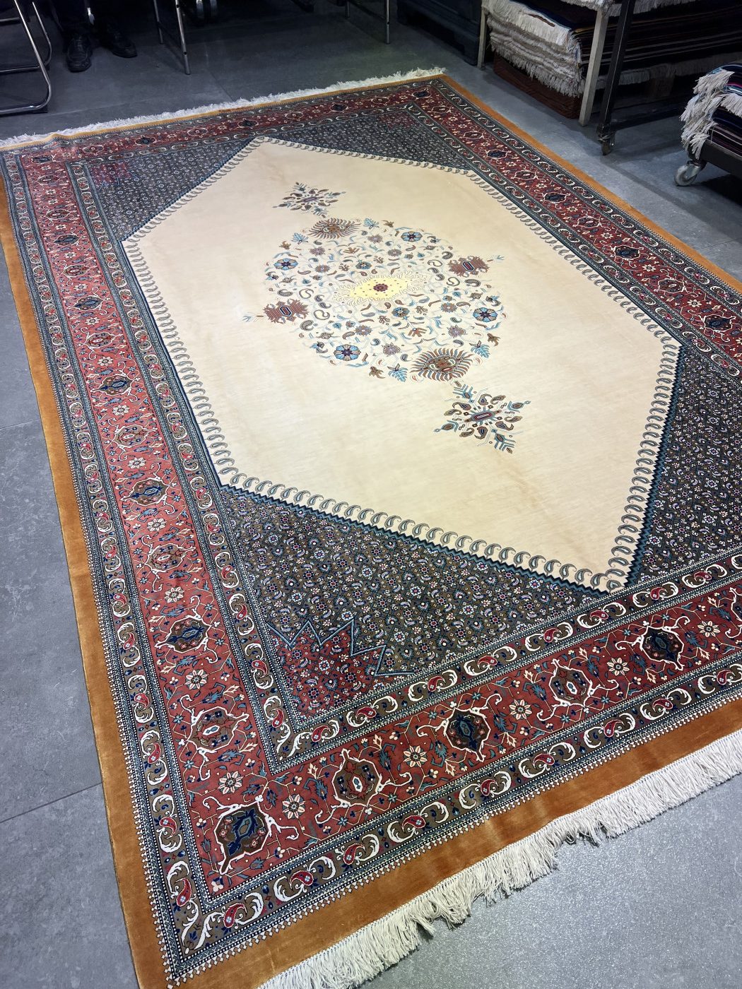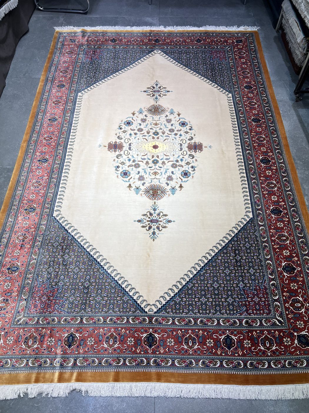 فرش دستباف شش متری قم (نقشه کف ساده کرم)