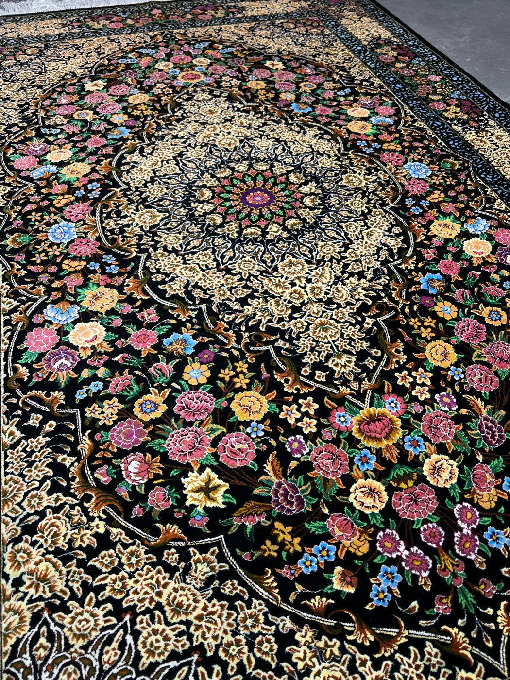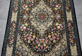 فرش دستباف تمام ابریشم و نفیس قالیچه قم (نقشه لچک ترنج مشکی)