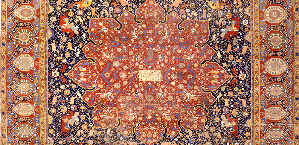 باتوجه به شواهد تاریخی به دست آمده نخستین فرش دستباف با طرح شکارگاه توسط هنرمندی به نام غیاث الدین جامی در سال 929 هجری قمری با گره فارسی بافته شده است. این تاریخ به همراه شعری زیبا توسط بافنده در ترنج مرکزی قرار گرفته که محتوای شعر به شرح زیر است.