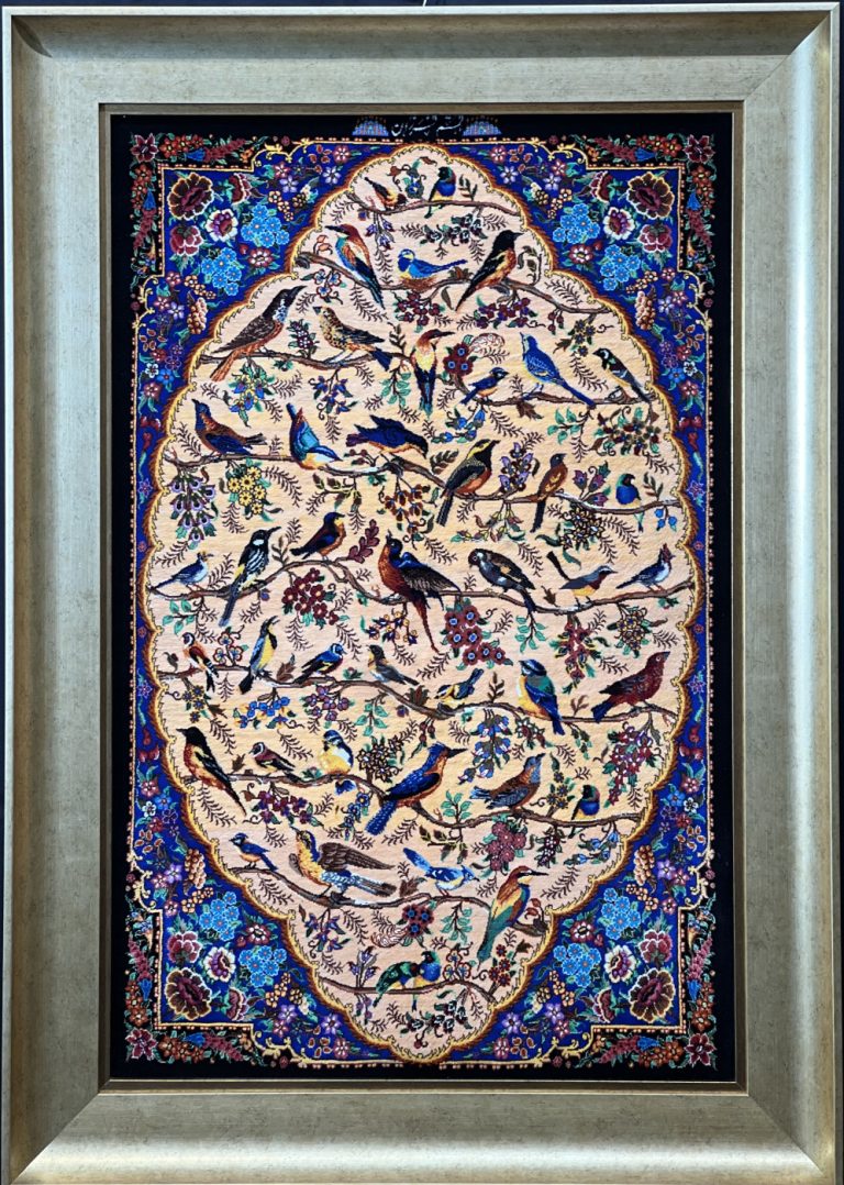تابلو فرش دستباف اندازه خاص تبریز (نقشه باغ پرندگان آبی)