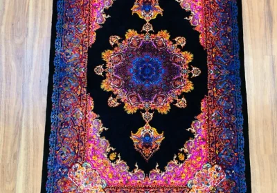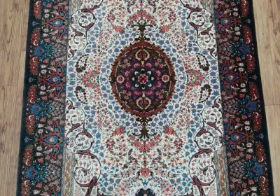 فرش دستباف قالیچه قم (نقشه ترنج دار سرمهای)